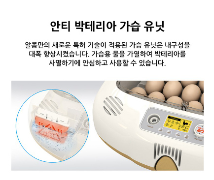 | 장점 | 자동 온습도 조절 / 자동 알 회전 / 국산 제조 / 정전 대비 배터리 내장 / 높은 부화 성공률 |